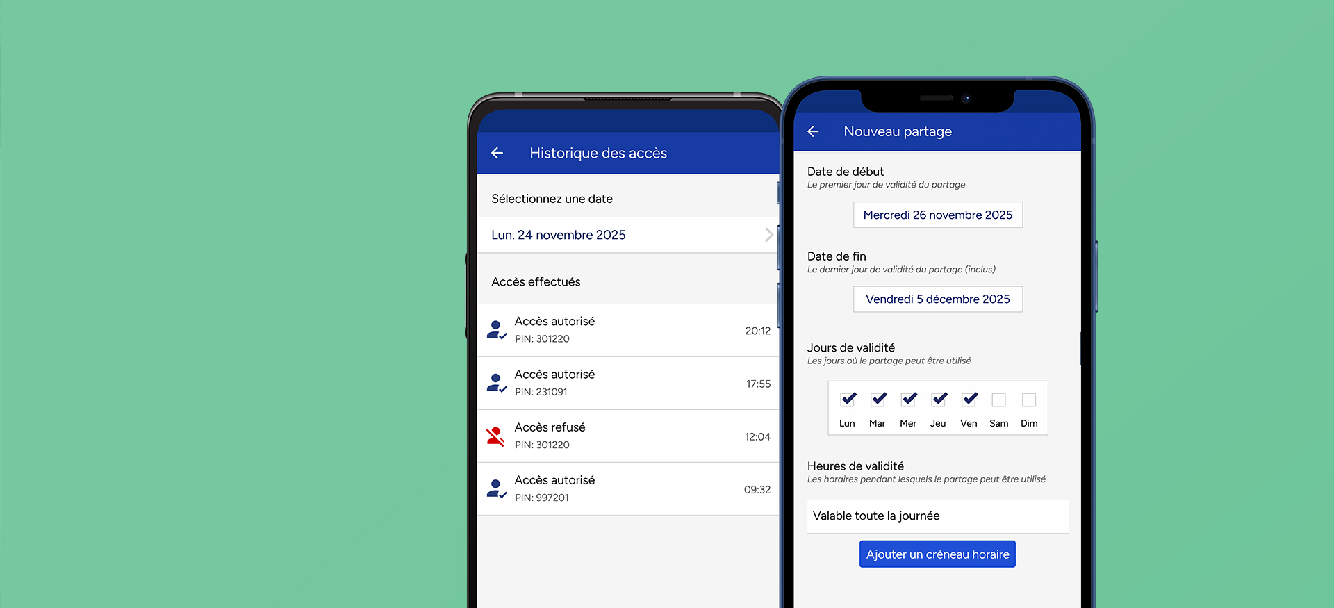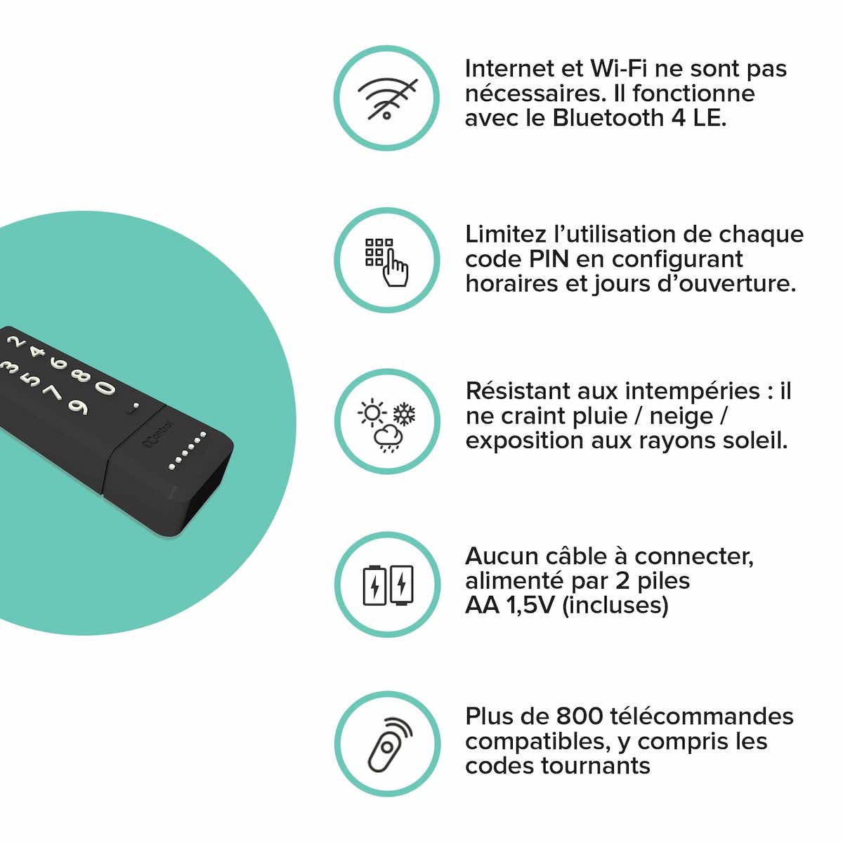Ouvrez portail et garage avec un code PIN. Vous pouvez également limiter chaque PIN en indiquant des jours/heures de validité.