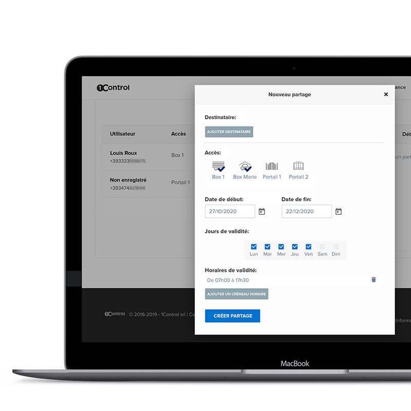 Partagez une ou plusieurs entrées (portail, porte basculante, porte, etc ...) avec des collaborateurs et clients, simplement en indiquant le numéro de portable de l'utilisateur que vous souhaitez activer, même à distance.