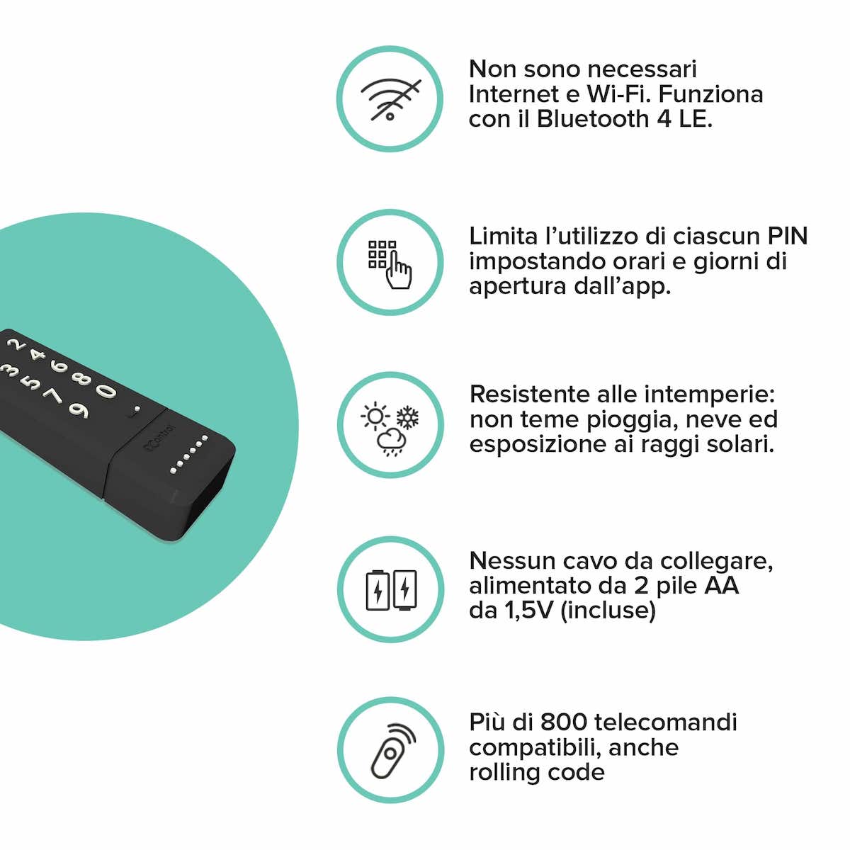 Apri cancello e garage con un codice PIN. Puoi anche limitare ciascun PIN indicando giorni/orari di validità.