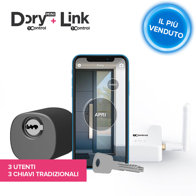 1Control DORY è l'unica serratura smart al mondo che ti consente di aprire la tua porta sia con lo smartphone che con la chiave tradizionale mantenendo una lunga durata delle batterie e in modo completamente silenzioso.